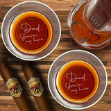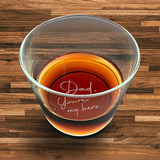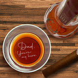 Looking for a fun way to let your dad know how special he is to you? Check out these BOTTOM ENGRAVED whiskey glasses...how cool are these?! Our cocktail glasses have a sturdy heavy base, perfect for dad as he enjoys his favorite spirits. As your father finishes up his favorite bourbon/whiskey drink, he will see a special message from you which reads "Dad, You are my hero!" These custom etched glasses make the perfect gift for Father's Day, birthdays, and more!