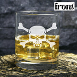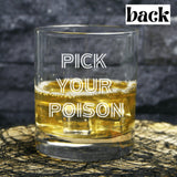 Our festive Halloween lowball glasses make the perfect gift for all whiskey lovers in your life! Each glass is laser engraved with an image of a skull and bones on the front, and the words "Pick Your Poison" on the back. Made of durable glass with a heavy base, each etched glass holds 11 ounces of whiskey and is dishwasher safe. In addition to being perfect for Halloween season, these custom glasses are great to use all year long. They make a stylish addition to any home bar or man cave. Pick up a single glass, or better yet, purchase a set of 2 or more!